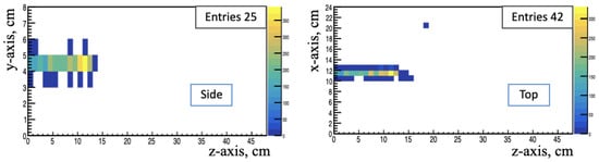 As an example, the proton track in two projections: top view (-plane) and side view (-plane), selected from a hadron beam with a momentum of 0.5 GeV/c in a magnetic field of 0.2 T, close to one in the ND280 magnet, stopped inside the volume of the second SuperFGD prototype, is presented in Figure 5.