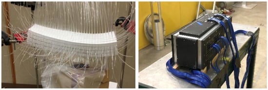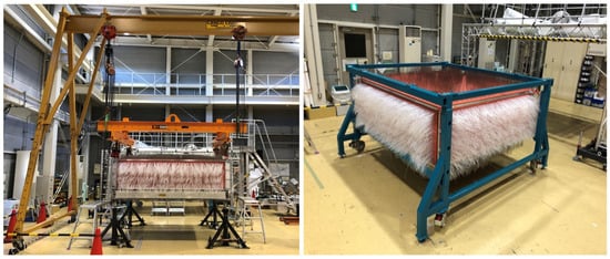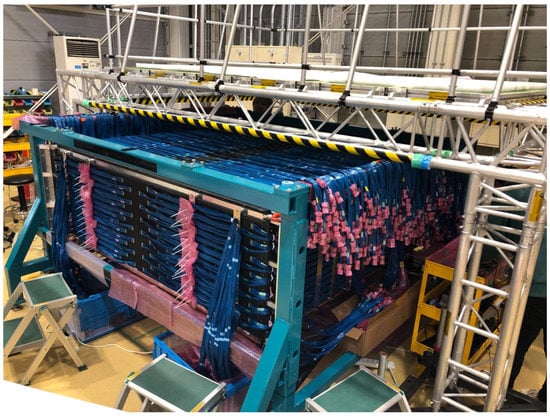 SuperFGD, as the key element of the upgraded ND280, is a fully active neutrino target consisting of about two million optically isolated plastic scintillator cubes with 1 cm sides. SuperFGD’s full size is cm and its total weight is about 2 tons. Each SuperFGD cube provides a 3D optical readout [16,17] by a diameter ⌀1 mm Kuraray Y11 (200) multiclad S-type wavelength shifting (WLS) fibers and Hamamatsu Photonics multi-pixel photon counters (MPPCs) of the S13360-1325PE series. The total number of SuperFGD electronic readout channels is about 60,000. The detector assembled using the fishing line method [18] is shown in Figure 3.