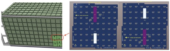 (Left) printed circuit boards (PCBs) attachment on the surface of the SuperFGD mechanical box. (Right) two types of connector position of multi-pixel photon counters (MPPCs) on the PCB.