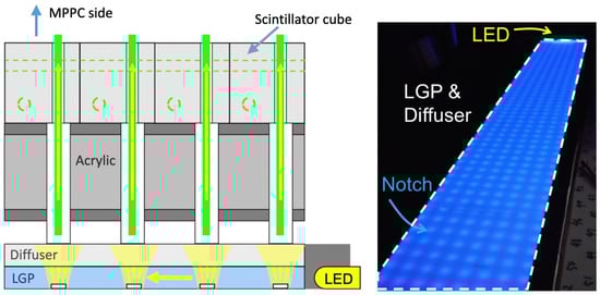 (Left) general view of the LED calibration module with a light guide plate (LGP). (Right) LGP module distributes light from the LED source directly to the MPPCs.
