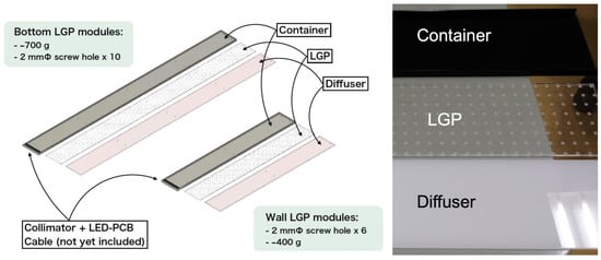 The LGP module includes the following components: a PCB with a LED-array and a LGP with a diffuser integrated into a light-tight black acrylic container with a thickness of about 8 mm (see Figure 9). It holds the LEDs in the correct position and provides an optical divider between the LGP modules and the external SuperFGD box surface. The inside clearance between the LGP and the container is 0.5 mm and to be filled with a shim plate, and the outside clearance between the LGP modules themselves is 1.0 mm.