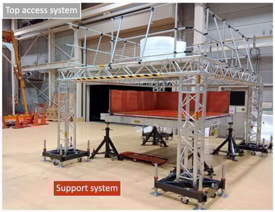 The SuperFGD assembly platform is a special equipment designed and constructed by the JINR group for the assembly of the SuperFGD with the possibility of unhindered access to all sides of the detector. The platform consists of two main parts: the top access system and the support system (see Figure 12).