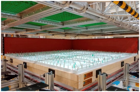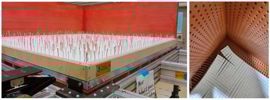 After these preparations, the first SuperFGD layer was placed on the bottom panel from the open sides of the box at the distance of 4–5 cm from the two side panels that are already mounted. When all fishing lines matched the box holes, this layer was pushed to the rigid corner of the box, as shown in Figure 14. This procedure is the same for all layers. In addition, each two layers of the SuperFGD cubes were aligned vertically using about 1000 ⌀1.3 mm steel spokes. Every six layers were fixed vertically with stop wooden panels (see Figure 13), with the exception of the first five SuperFGD layers, which were used to check the safety of the fishing lines during the detector assembly.