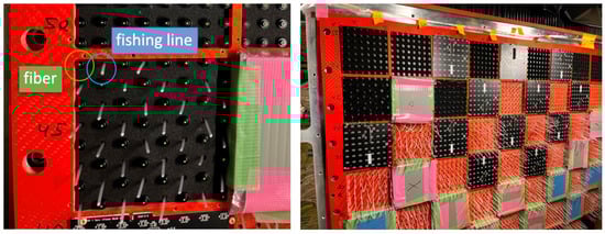 On the removal side, the first group of 32 fishing lines was removed according to the chessboard scheme (see Figure 17) in the unit of through holes at the PCB level, without waiting for the insertion of the WLS fibers from the opposite side. Whereas, in the case of the second group of 32 fishing lines, the work on replacing them with WLS fiber was carried out one-by-one. The replacement of the welding rods with the optical WLS fibers in the vertical direction using the top access system was also carried out.