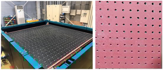 (Left) a single unit of through holes on the upstream panel. (Right) general view of the upstream panel during the replacement of horizontal fishing lines with the WLS fibers.