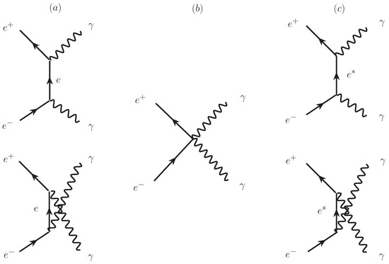 - Gakh, G.I.; Konchatnij, M.I.; Merenkov, N.P.; Gakh, A.G. Effects of excited electron and contact eeγγ interaction in e+e−→γγ reaction. arXiv 2022, arXiv:2211.16306. [Google Scholar] [CrossRef]