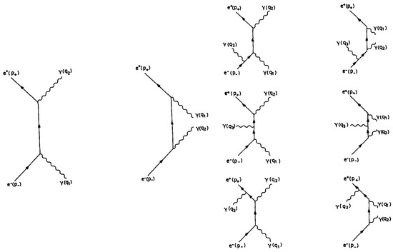 - Berends, F.A. et al. [CALKUL Collaboration]. Multiple bremsstrahlung in gauge theories at high energies: (IV) The process e+e−→γγγγ. Nucl. Phys. B 1984, 239, 395–409. [Google Scholar] [CrossRef]