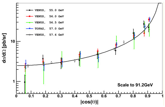 The differential cross-section of the reaction from VENUS [79] and TOPAS [81] experiments. The bars show statistical uncertainties. The black line is the QED- cross-section (6). The plot is obtained with GeV. A deviation from QED in the differential cross-section of the reaction would manifest as an observation of a difference between the QED calculations and experimental measurements.