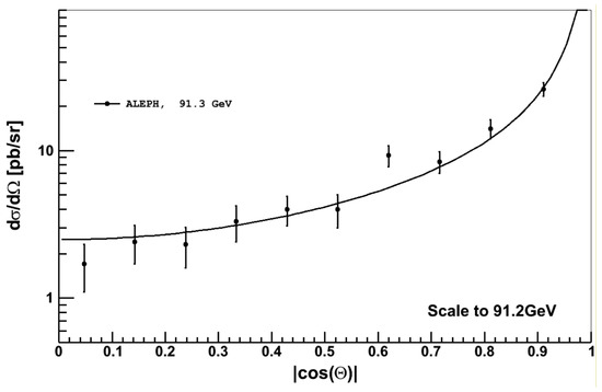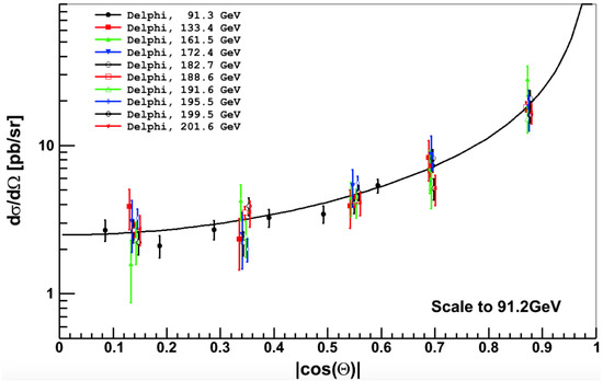 In this paper, we analyze deviations from QED by combining data on the differential cross-section of the reaction measured via various storage ring experiments. Specifically, the VENUS Collaboration investigated this reaction in 1989 [79] at the center-of-mass energies, = 55 GeV–57 GeV, while the OPAL Collaboration [80] studied it in 1991 at the pole at = 91 GeV. The TOPAS Collaboration also investigated this reaction in 1992 at = 57.6 GeV [81], while the ALEPH Collaboration studied it in 1992 at the pole at = 91.0 GeV [82]. Moreover, the DELPHI Collaboration investigated the reaction from 1994 to 2000 at energies ranging from = 91.0 GeV to 202 GeV [83,84,85], while the L3 Collaboration studied it from 1991 to 1993 at the pole, with = 88.5 GeV to 93.7 GeV [86]. The L3 Collaboration also studied the reaction in 2002 at ranging from 183 GeV to 207 GeV [87], and the OPAL Collaboration investigated it in 2003 at ranging from 183 GeV to 207 GeV [88]. Deviations from QED were investigated through the study of contact interactions and excited electron exchange displaced as in Figure 1. Colleagues of some of the authors of this paper have reviewed experimental studies and models of deviations from QED in their Theses [89,90,91]. For earlier review, see [92].