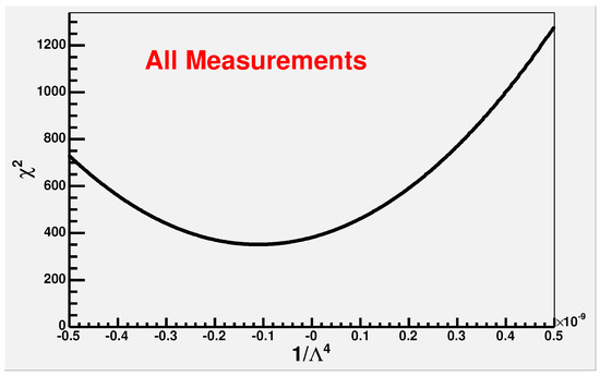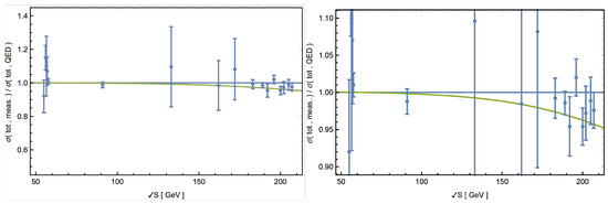 A common method for searching for deviations from QED is to use a -test to compare experimentally measured cross-sections with predicted QED cross-sections. To incorporate a non-QED direct contact term into the QED cross-section, an energy scale is introduced via Equation (33). can be interpreted as defining the size of the object where annihilation occurs, which can be calculated using either the generalized uncertainty principle [111,112,113] or the electromagnetic energy, E, and wavelength, ,114] of the light emitted by the object. The wavelength, , must be smaller or equal to the size of the interaction area. If the -test exhibits a minimum for a certain , the latter defines the region in which annihilation must occur via , where with c the speed of light. We assume that regulates the size of the electron according to