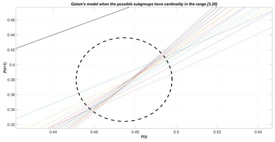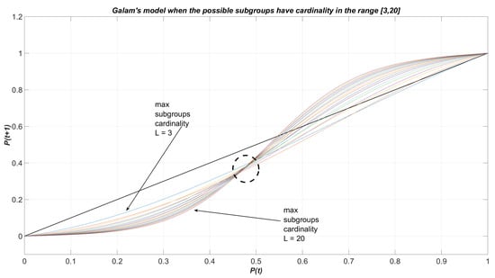constitutes the threshold value such that when is greater than , then all agents will eventually have opinion ‘+’. Conversely, when all the agents will definitely think ‘−’ if . The value is the fixed point of Equation (1) and is called the killing point or tipping point of the model. In Figure 1, one can observe the dynamics described by relation (1), when the largest cardinality L of the subgroups takes integer values in the interval and , for any k: for each of the 18 curves, the killing point is identified by the intersection with the bisector line other than the extreme points and . Observe that for small values of L no killing point appears (or equivalently, it coincides with the extreme point ). Figure 2 shows a zoomed in perspective of Figure 1.