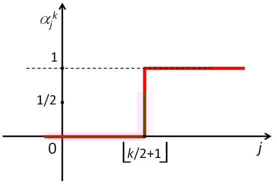 As mentioned, probabilities should reasonably increase with the number j of ‘+’ in a subgroup, and decrease with respect to the size of the group k. In this regard, it is reasonable to expect for the probability to become negligible when the number j of ‘+’ in a subgroup is relatively small (i.e., much lower than the strict majority), and to become close to 1 as the number of ‘+’ noticeably increases (i.e., higher than strict majority). In general, the probability that all agents in the subgroup will adopt the opinion ‘+’ is conceivably a function rising from zero to one as j increases. If one assumes that this function of j is linear, one may precisely define the probabilities as (see Figure 4)