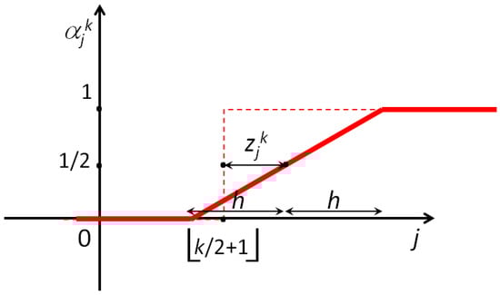 When , the probabilities defined in Equation (4) are exactly the same as in Equation (3). The value of in (4) represents a shift (either positive or negative) from the value , while the slope of the ramp in Figure 4 is .