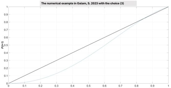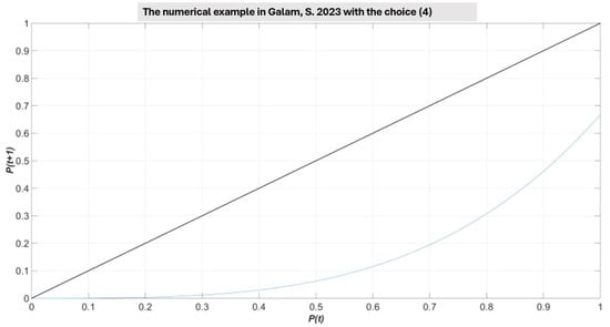 To better grasp the geometric insight behind the choice of the parameters in (4), let us consider the simple numerical example reported in Ref. [6], where , , and (and for all j and k). As reported in Ref. [6], the killing point () lies in between and (see Figure 5). Then, in Figure 6, there is also the model (2) with the choice (4), after setting for any j and k. One can immediately infer that the dynamics of Galam’s model [6] is definitely spoiled when the choice for the coefficients in Equation (3) is replaced by Equation (4). Equivalently, even in case (complete consensus among agents to think +) then the choice (4) imposes a regression towards the stable point given by the origin.