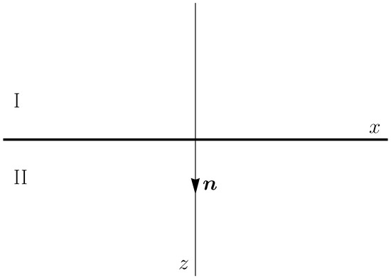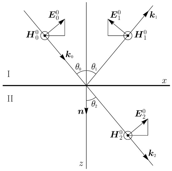Let us start with the case of transverse electric polarization when the amplitudes of the electric field of the incident, , transmitted, , and reflected, , waves are perpendicular to the plane of incidence and directed along the positive direction of the y-axis (see Figure 2). The corresponding wave vectors are , , and , and the amplitudes of the magnetic field, which lie in the plane of incidence, are , , and .