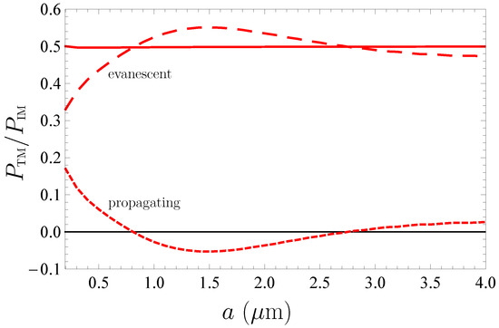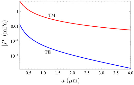 As seen in Figure 4, the major contribution to the Casimir pressure at nm is given by the transverse magnetic polarization, whereas the transverse electric one makes only a negligible small contribution. Thus, at nm, we have , i.e., . The role of the TM polarization only increases with increasing separation. As two more examples, at and m one finds that and , respectively. This results in the following respective fractions of in the total Casimir pressure: and 0.999993.