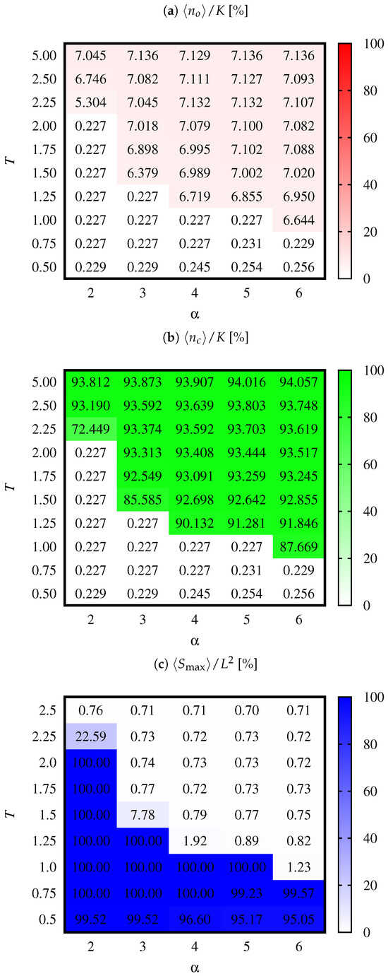 In Figure 1, the results of simulations concerning the average final (at ): number of opinions, (Figure 1a), number of clusters (Figure 1b), and their largest size, (Figure 1c), are presented. The values of and are normalised to the number K of opinions available in the system while is normalised to the system size . Thus, these numbers are presented as percentages.