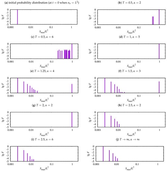 In Figure 2, examples of probability distribution function, F, for the size of the largest clusters are presented. Figure 2a shows the initial distribution (i.e., at , when ) of the largest cluster size, while Figure 2b–j show examples of the typical distribution obtained at the end of simulations, i.e., at . In Figure 2b,c,h,i, the probability distribution of the largest cluster size for the “corners” of the parameter system plane —see Figure 1—are presented. Furthermore, in Figure 2j, we present the function F for the limiting case , .