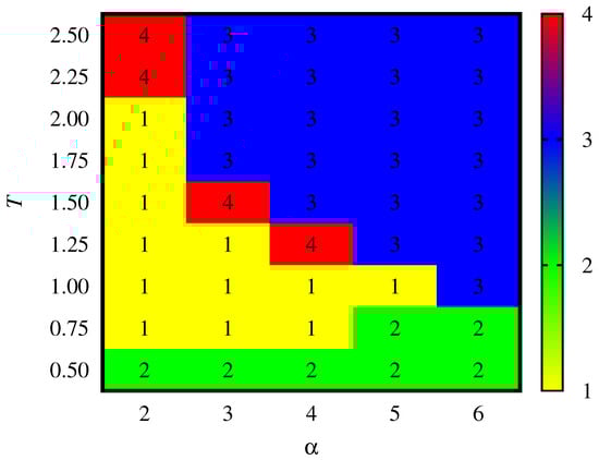 These four scenarios, observed after system time evolution up to time steps, can be mapped into space to create the phase diagram of the computerised model of the Nowak–Szamrej–Latané social impact theory []. This diagram is presented in Figure 3 and the numbers there correspond to the list enumerator given above.