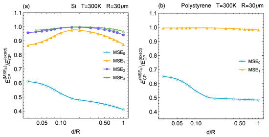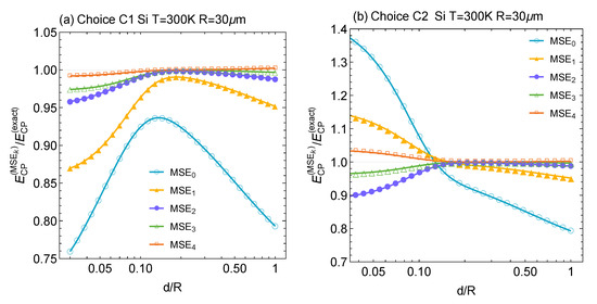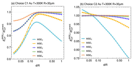 In Figure 2, Figure 3 and Figure 4, we show the ratios of the MSE for the CP energy and the exact result for the CP energy obtained from Equation (13) versus for Au, Si, and polystyrene. In the case of Au, a comparison of Figure 2a with Figure 2b shows that the rate of convergence is much faster with the asymmetric choice C2 of the coefficients. Actually, with the C2 choice, already differs from the energy exact values by less than one percent for all displayed separations: specifically, the maximum error is of for , while for the error is as small as %. In the case of Si, the performance of the choice C1 is better than that for C2. Indeed, with the C1 choice, the maximum error of is 0.8% for , while the minimum error is 0.2% for , while for the choice C2, the maximum error is 3.4% for . In the case of polystyrene, the performance of C1 case is amazingly good, since with the maximum error is 0.6% for , while for the error is as low as 0.003%. For polystyrene, the rate of convergence of (C2) is instead quite poor.