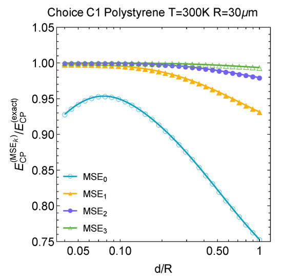 The CP energy can be straightforwardly obtained as an MSE since the SSO and the operator can be computed by substituting for the free Green functions in Equations (5) and (6) an expansion in vector cylindrical waves. In Figure 5, we again show the numerical results for the ratio of the MSE for the CP energy at MSE of the order k and the exact result for the CP energy obtained from Equation (17). The materials, temperature, and geometric lengths are the same as in the case of a sphere. For Si, one observes that the MSE with the choice case C1 has converged at order to the energy exact calculations within approximately , with the largest deviations at the shortest () and longest () considered separation. The deviation is minimal at intermediate distances around , with an error of only . Hence, the performance of the MSE for an infinite cylinder is quite similar to a compact sphere. We do not consider the coefficients from the C2 choice as they performed worse than the choice case C1 for a sphere. For polystyrene, we consider again only the choice case C1, for the same reason. Due to its low dielectric contrast, one expects the choice C1 to give good convergence of the MSE at low orders. Indeed, the rate of convergence is quite fast so that the MSE can be terminated at the order already, with a maximum deviation from the energy exact value of only at the separation . Let us note that, in general, that with the choice case C1, the lowest order , the estimate of the energy for the cylinder is not as good as that for the sphere. This is presumably due to arbitrarily long-range charge and current fluctuations along the cylinder, which require at least one power of the operator to be described properly.