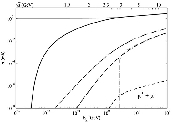 It is worth noting that the logarithmic Racah terms in Equation (2) (and then the coefficient a) do not depend on the masses (Compton wavelengths) of the produced leptons. As an example, the cross-section of -pair production, which scales as the inverse lepton masses compared to -pairs, is displayed in Figure 1 by dashed line.