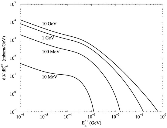 Using expressions from Ref. [27], we obtained differential cross-sections of positron production as a function of the kinetic energy, , of positrons in the laboratory frame. We took into account that the c.m. of the pair moves with the velocity relative to the c.m. of the colliding protons; here, . We also assumed that the distribution of positrons is isotropic in the c.m. of . Therefore,