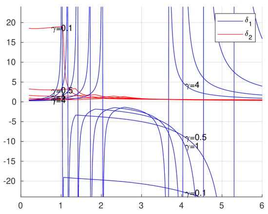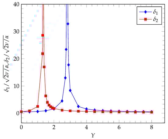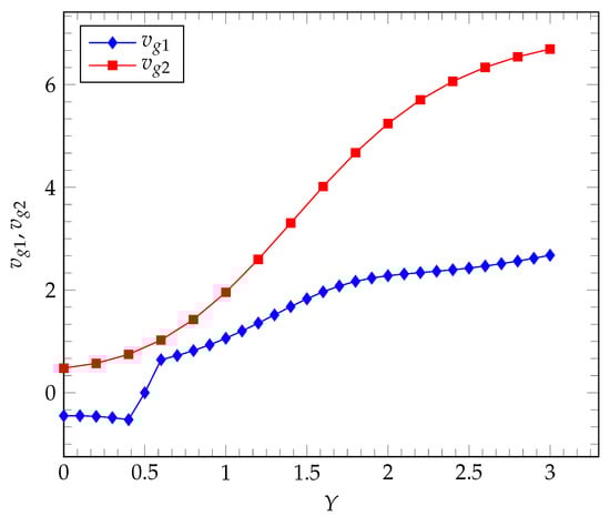 In Ref. [], rotating magnetohydrodynamic flows of a thin stratified layer of plasma were studied. Plasma was placed in a gravity field and in an external vertical magnetic field, and it had a free boundary. It was divided into two layers of different densities, and shallow water conditions were applied. Motion equations were derived under beta plane approximation, and a linear theory was presented. Solutions were found in the form of magneto-Rossby waves and corrections to them, describing the effects of stratification. As in Ref. [], qualitative analysis of the dispersion curves was carried out, and the synchronism condition (Equation (21)) was analyzed.