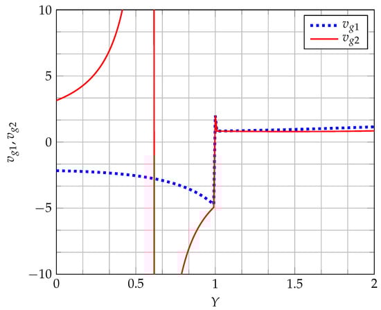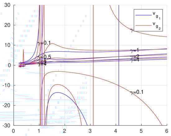 To find the waves that satisfy the above condition, a simple qualitative visual method was proposed in Ref. []. Suppose one wants to know if a wave with a certain wave number can participate in the three-wave interaction. Then, it is necessary to plot a dispersion curve and plot its copy shifted by (see Figure 2). If the curves intersect at some point , then the synchronism condition is satisfied. It was shown that decay instabilities as well as wave amplification exist in both cases. The instability increments and the amplification coefficients are determined.