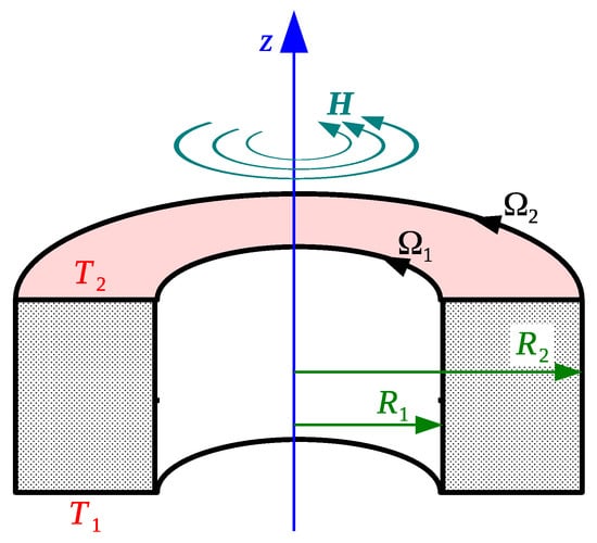 The study of many astrophysical systems leads to complex problems of convection of an electrically conducting fluid in the presence of a magnetic field and rotation. These include the problem of generating the magnetic field of Earth and planets, stars and galaxies. Here, questions arise such as stability, convection and developed turbulence in the presence of a magnetic field and rotation, self-excitation of a magnetic field during the movement of a conducting fluid and the reverse influence of the excited field on movement. The generation of secondary magnetic fields was studied in Ref. []. It was shown that a rigid non-magnetic conductor (in the shape of a hollow cylinder) rotating in an external magnetic field generates a secondary multipole magnetic field, the magnitude of which is proportional to the rotation speed and the magnitude of the primary magnetic field, and it also depends on the electrical resistivity of the conductor as well as its shape and size. Generation of the field in fluids is facilitated by the helicity of the movement, and the presence of Coriolis force contributes to the creation of helicity in convective movements. Convection and rotation are the main components of the magnetohydrodynamics(MHD)-dynamo mechanism in geophysics and astrophysics [,].