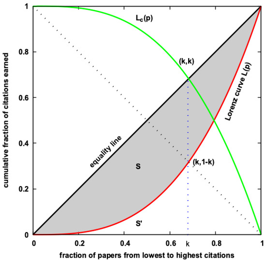 In 1905, American economist Lorenz [2,3] developed the Lorenz curve, a graphical representation of the distribution of wealth in a society. To construct this curve (illustrated by the red curve in Figure 1), one organizes the society’s population in ascending order of their wealth and then plots the cumulative fraction of wealth, denoted as , held by the poorest p fraction of individuals. One can similarly plot the cumulative fraction of citations against the fraction of papers that attracted those many citations. As indicated in Figure 1, the Gini index is calculated from the area between the equality line and the Lorenz curve, divided by the area (1/2) below the equality line for normalization. As such, signifies perfect equality and corresponds to extreme inequality. The index k is given by the fixed point of the complementary Lorentz function . As such, k gives the fraction of citations attracted by the top cited k fraction of papers and means perfect equality, while extreme inequality corresponds to .