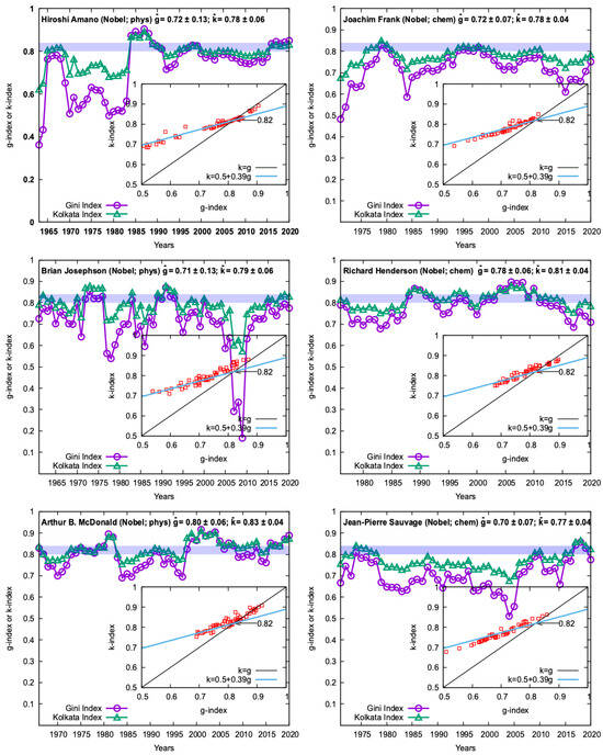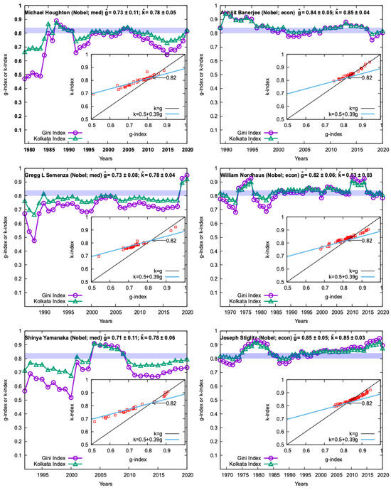 One can see from Figure 2, Figure 3, Figure 4, Figure 5 and Figure 6, for all the above-mentioned thirty scientists that for many of them (mostly Nobel prize winners and highest rank c-scorers), the g-index value goes over the k-index value in one (or multiple years) by crossing the line (see the corresponding insets). These crossings of the indices (at values above 0.80 value) preciously indicates large inequalities and entry into the SOC state [17] of the citation statistics of these scientists (see Table 1 for consolidated results of g and k).