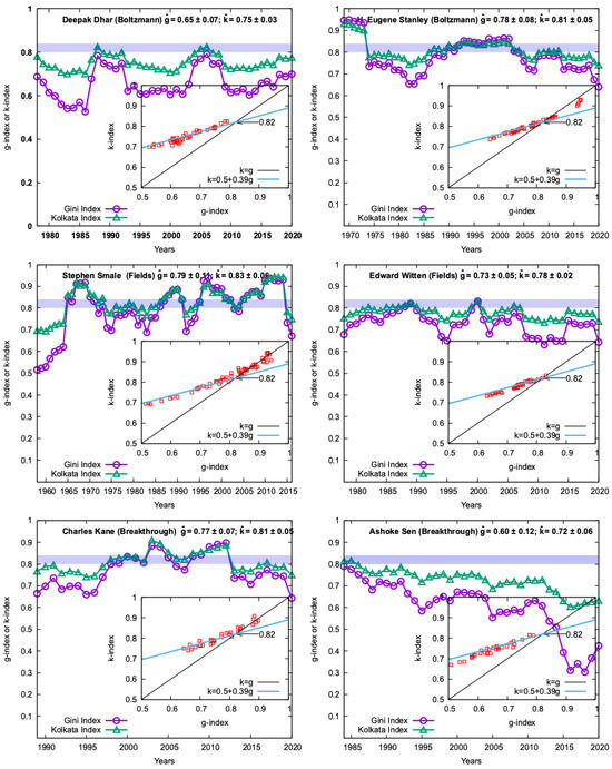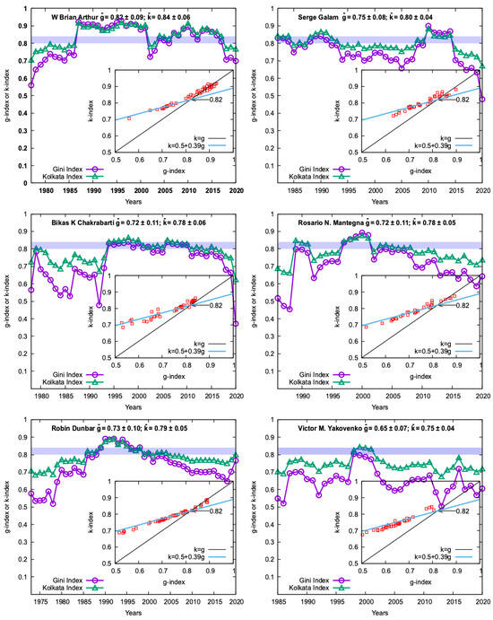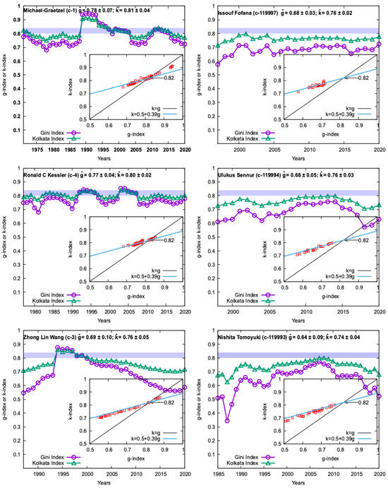Yearly variations of the citation inequality indices, Gini (g) and Kolkata (k), for three top-most Stanford cite-scores and three lower rank entries from the “top 2% Stanford cite-scores” [15,33]. The indices are calculated using the present citation data for the publications within a 5-year window, starting from first recorded one in Google Scholar, and the window sliding by one year. The corresponding year shown is mid mid-year of the window until 2022 (shown for year 2020 for the last 5-year window). The g value crossing above (and coming down) the k value marks the precursor of onset (leaving) the SOC state with time. The inset shows k versus g (in red) over the entire career of the scientist. It fits well with the linear (Landau-like) relationship, , suggesting a crossing SOC precursor point at .