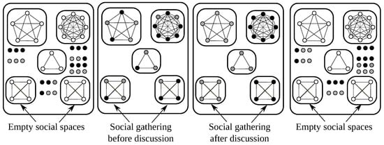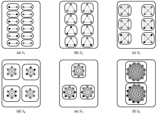 In our study, we consider a population with individuals as it offers a large enough number of social spaces; even in this case, the partition number is too large for a systematic analysis of all the possible spaces since, for , the partition number is 1575 [] (sequence A000041). Therefore, we consider the special case in which all the tables have the same size. In order to be able to assess the role of the lobby, we limit its size to a maximum of six individuals. The social spaces that we consider, together with the strategic seating choices of the lobby members, are shown in Figure 2. Similar to that in Galam’s model, when a table has the same number of contrasting opinions, the bias is in favor of the individuals who are “against ”.