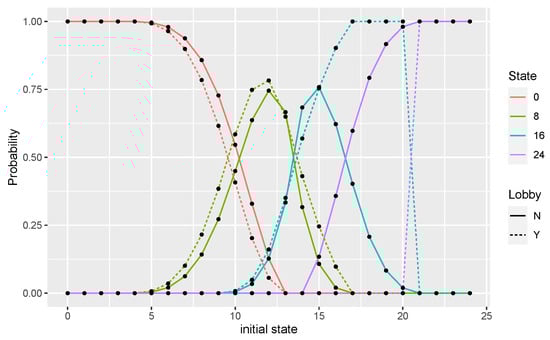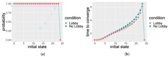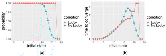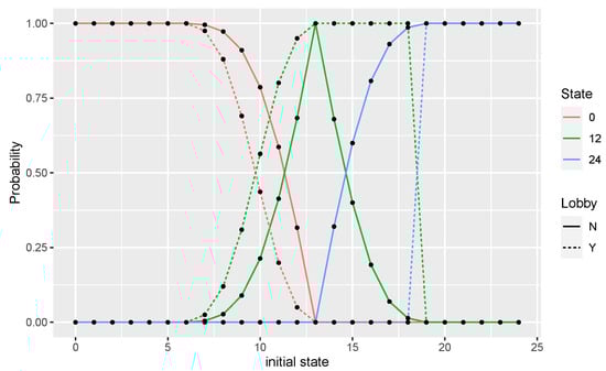 We consider individuals and the social space , which consists of two tables of the same size . The choice of the space is due to the fact that the multinomial coefficients in the transition probabilities defined in Equations (1) and (2) become binomial coefficients and the notation is simpler. At the end of each time period, the opinions are homogeneous; therefore, only the states and 24 have positive probabilities. From Equation (1), one can derive the positive entries of the matrix for the scenario without a lobby: