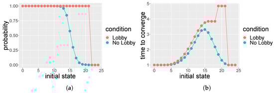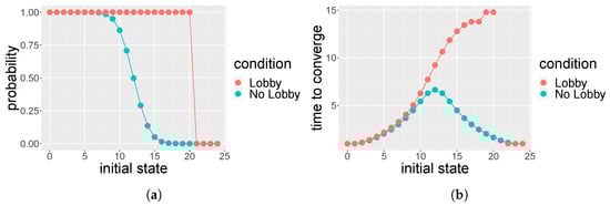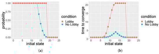 From the transition matrices, we compute the probabilities of converging to the absorbing states as illustrated in Ref. []; those probabilities are graphically represented, together with the average time of convergence to the absorbing states, in Figure 3, Figure 4, Figure 5, Figure 6, Figure 7 and Figure 8. For each social space (), Figure 3, Figure 4, Figure 5, Figure 6, Figure 7 and Figure 8, left, represent the probabilities of convergence to the respective absorbing states from any initial states, . The graphs in Figure 3, Figure 4, Figure 5, Figure 6, Figure 7 and Figure 8, right, represent the mean time, , of convergence towards the absorbing states, starting from any initial state j. Since we are considering discrete states, the lines connecting the dots are for illustrative purposes only. As expected, when , opinion is no longer a minority opinion. In Appendix A, we provide the pseudocode for the computation of the transition matrices without a lobby and the transition matrices of the population with the lobby (the R code and the libraries to replicate our results are available from the authors upon request). As j increases to values larger than 18, we correspondingly reduce the number of the lobby members; for example, when , the number of the lobby members are four, and, in the social space , they would only sit at two tables instead of three.
