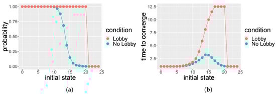 The social space exhibits a new absorbing state that can be deduced from Figure 2b when the initial state of the population has a lobby with three members. Two of these members strategically sit at the same table, leaving the other member alone at a different table. According to the table majority rule, the pair of lobbyists will persuade the third person at the table in favor of opinion , while the lone lobby member will be persuaded in favor of opinion , thus maintaining the size of the lobby as originally three members; this is an impasse situation similar to that discussed in Ref. []. However, it must be noted that, in this social space, the impasse can only occur when the lobby is active. In Figure 4b, the mean time of convergence to this new absorbing state is not reported as it is not a unanimous state. According to Galam’s definition (see [] (p. 577) for details), a killing point is the unstable fixed point, producing the flow and its direction, determined by the stochastic dynamical system describing the time evolution of the hoax support. In , one can see in Figure 4a that the state is the killing point when there is no lobby; in contrast, in this social space, when the lobby is present, there is no killing point and this case suggests a bang-bang result []. The mean absorption time of unanimity is higher around the killing point; the process is even slower when generated by the lobby, as shown in Figure 4b.