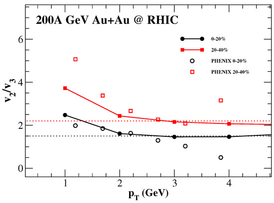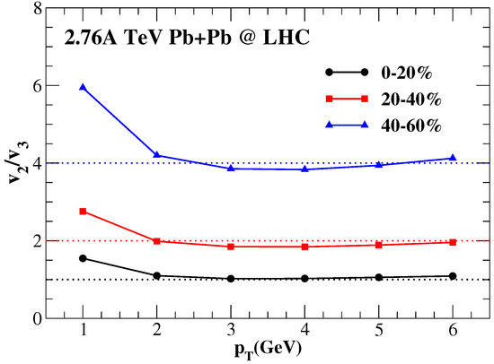 Interestingly, the larger- part of the ratio of elliptic and triangular flow parameters is found to be less sensitive to the value of as shown in Figure 1, Figure 2, Figure 3, Figure 4 and Figure 5.