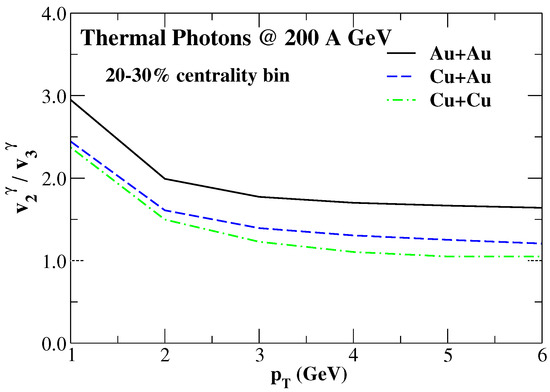 The predicted ratio of to of thermal photons from 20–30% centrality collisions of AuAu, CuAu, and CuCu collisions at 200A GeV [79].