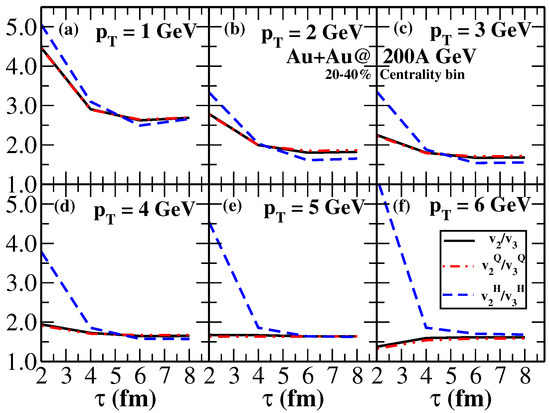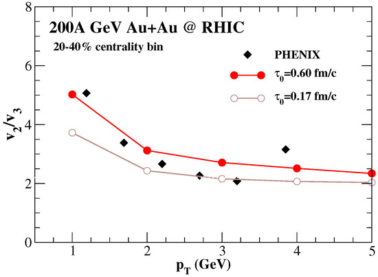 Although the individual anisotropic flow parameters show a strong sensitivity to the initial formation time [58], particularly at larger values, due to the larger relative contribution in photon production from the hadronic phase, their -dependent ratio does not change significantly in the same region (see Figure 4 when the formation time is increased from 0.17 fm/c to 0.60 fm/c at RHIC).