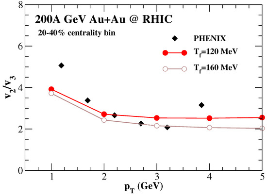 Additionally, a smaller value of the freeze-out temperature would result in a much larger contribution to from the hadronic phase and subsequently a significantly larger total for thermal photons [57]. However, it was observed that the ratio is a little sensitive to the value of kinetic freeze-out temperature. Even a significant drop in the value of from 160 MeV to 120 MeV changes the ratio only marginally, as shown in Figure 5.