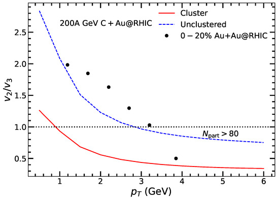 The ratio of photon anisotropic flow from the collision of triangular -clustered carbon with gold at RHIC energy is shown in Figure 8. As the photon is larger than in such collisions, the ratio is found to be less than 1 in the region 1 GeV.