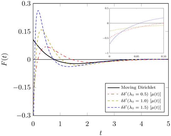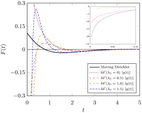 The force (see Equation (71)) on a moving mirror (indicated as ) as a function of time, presented in natural units, for some values of , where . The force on a moving Dirichlet mirror is presented for comparison. Inset: the behavior of the moving mirror’s forces near zero. See text for details.