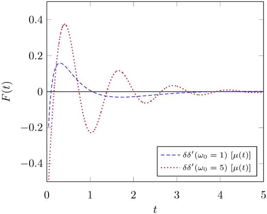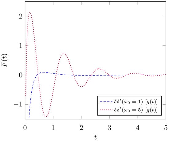 Presented in Figure 2, the force as a function of time is plotted for two different values of . As the frequency of oscillation increases, the number of peaks increases along with it. Compared to the analogous plot for the mirror with time-dependent properties, there is a larger increase in the magnitude of the force for the moving mirror. This is expected, as the asymmetry in particle production for the moving mirror scales as when compared to that of the mirror with time-dependent material properties [,]. Thus, there is an accompanying increase in net force on the moving mirror as the frequency of oscillation increases.