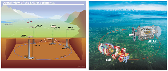 Left: LHC underground and terrain areas with four experiments. Right: ATLAS and CMS experiments.
