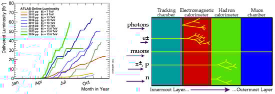 Figure 2, left, shows the luminosity delivered to the ATLAS experiment from proton–proton collisions, while Figure 2, right, shows a schematic view of particle identification in the ATLAS or CMS detectors.