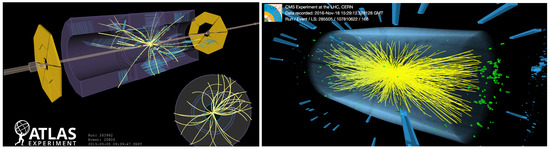Event displays of typical recorded proton–proton collisions are shown in Figure 3. The proton–proton collisions in the center of the detectors lead to different reactions, including the production of the SM Higgs boson and potentially the production of the Higgs boson predicted in extended models.