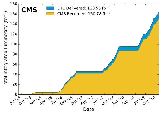 - CMS Collaboration. Public CMS Luminosity Information. Full Summary: Proton–Proton Collisions Since 2010 (Run 1 + Run 2 + Run 3). Available online: https://twiki.cern.ch/twiki/bin/view/CMSPublic/LumiPublicResults (accessed on 30 May 2024).