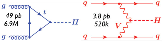 Feynman diagrams for (left) and (right) Higgs boson production modes (see text for details). The production cross-sections (in pb) are given for 13 TeV center-of-mass energy [8] and the expected rates (“M” stands for “” and “k” stands for “”) are given for 140 fb−1 integrated luminosity [9].