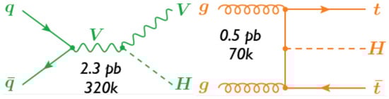 Feynman diagrams for (left) and (right) Higgs boson production modes (see text for details). The production cross-sections (in pb) are given for 13 TeV center-of-mass energy [8] and the expected rates (“k” stands for ) are given for 140 fb−1 integrated luminosity [9].